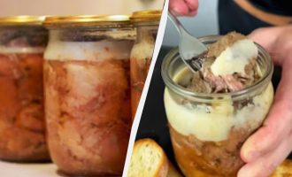 Sastojke izradite u pire mikserom, stavite u posude i prelijte otopljenim maslacem.