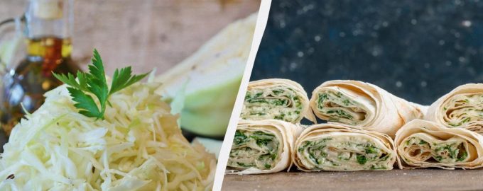 Uzmite dva lista tankog pita kruha (otprilike 30×40 cm). Na prvu ravnomjerno rasporediti polovinu nadjeva od kupusa, ostaviti malo ruba. Zarolati sa široke strane lagano pritiskajući.